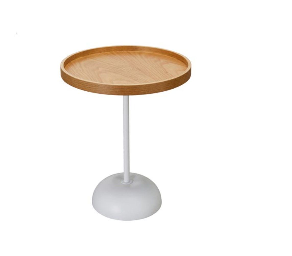 Minimalistic side table with a wooden table top on a single stem metal base.