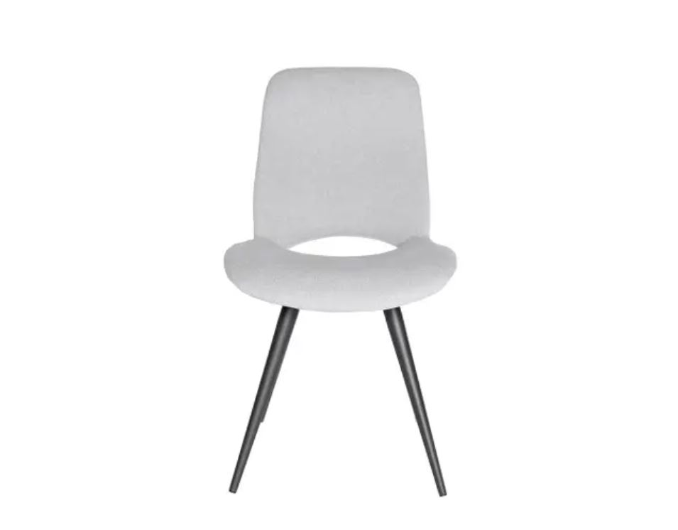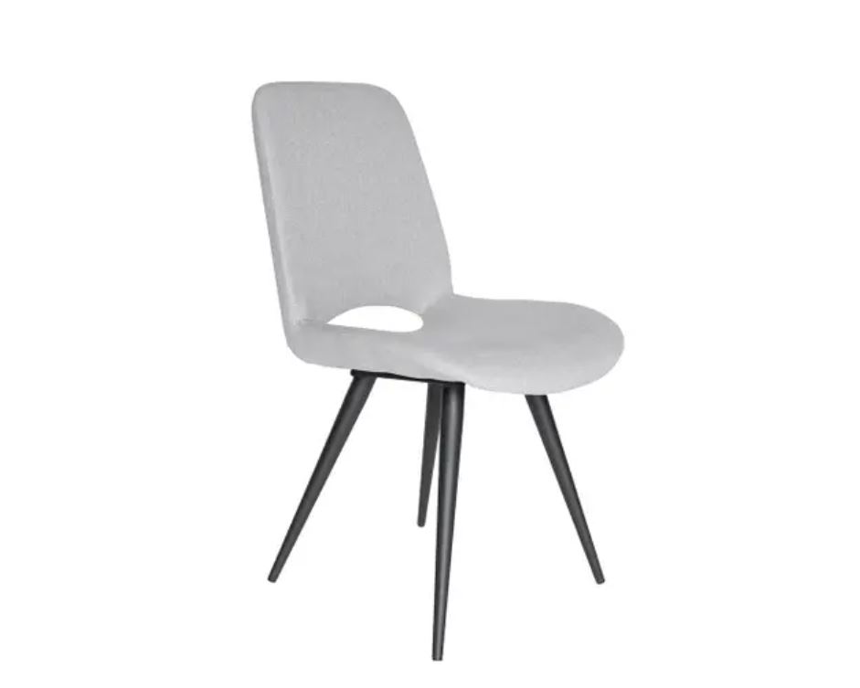 Modern dining chair in light grey fabric with power coatad black metal legs.