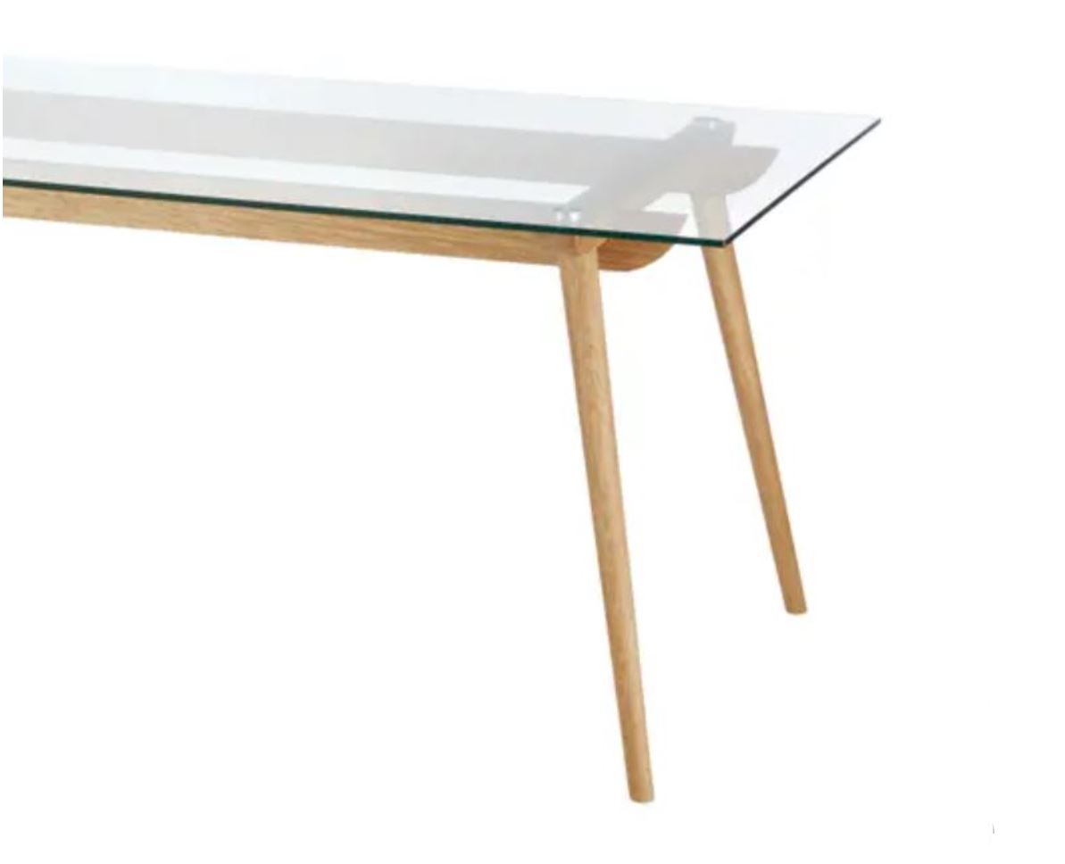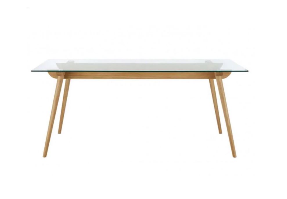 This glass dining table has a timber frame, chrome detailing and a glass top. A matching entertainment unit, console and coffee table are available.