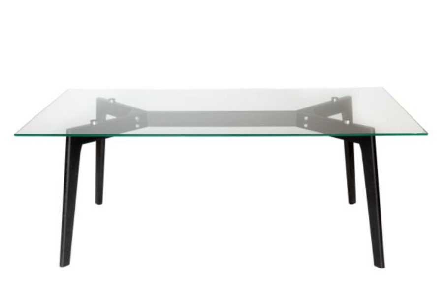 Clear tempered glass rectangular coffee table with black legs.