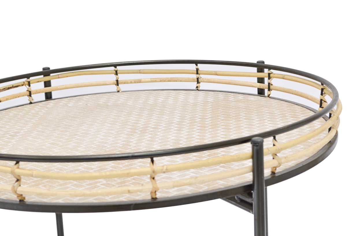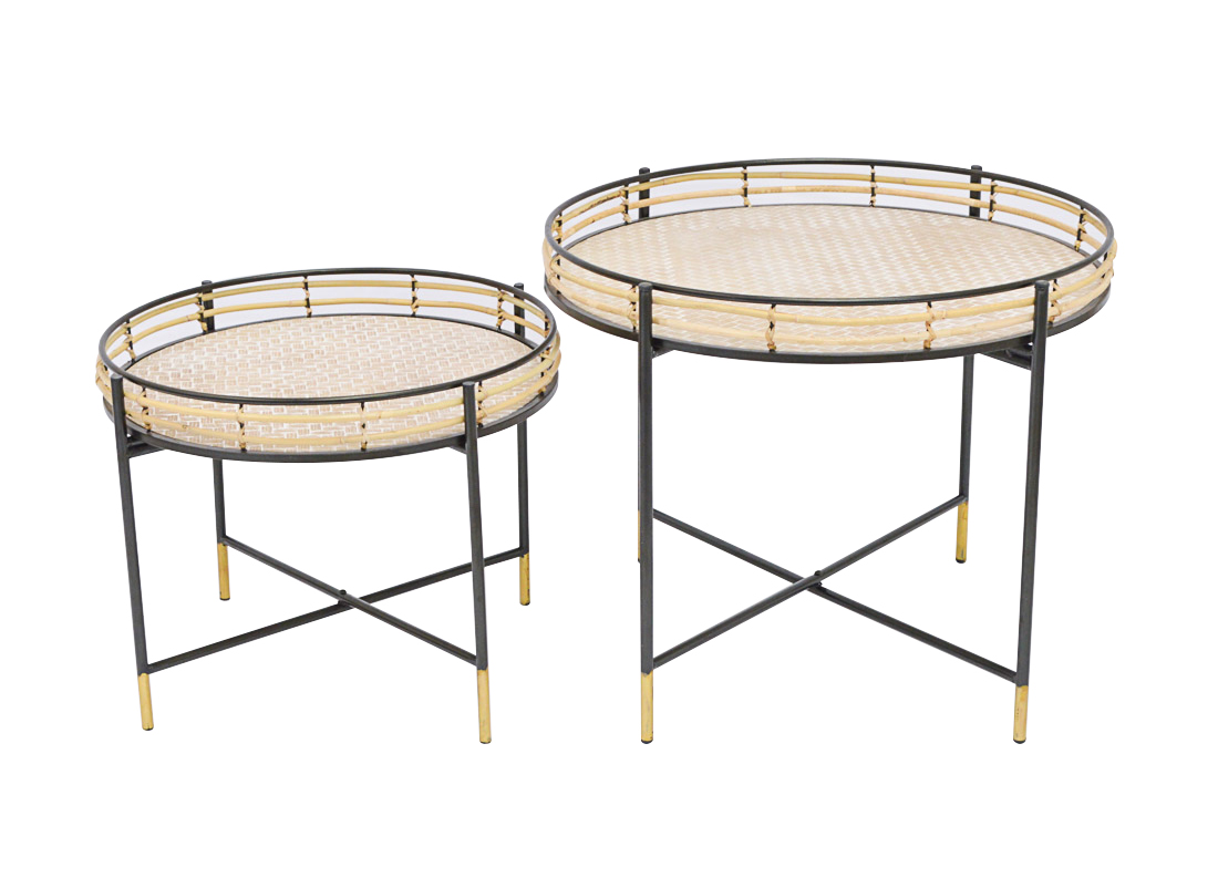 A set of round, nested rattan coffee tables with black metal legs. The gold detail on the legs adds a touch of elegance.