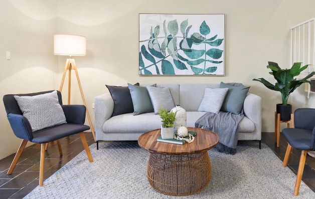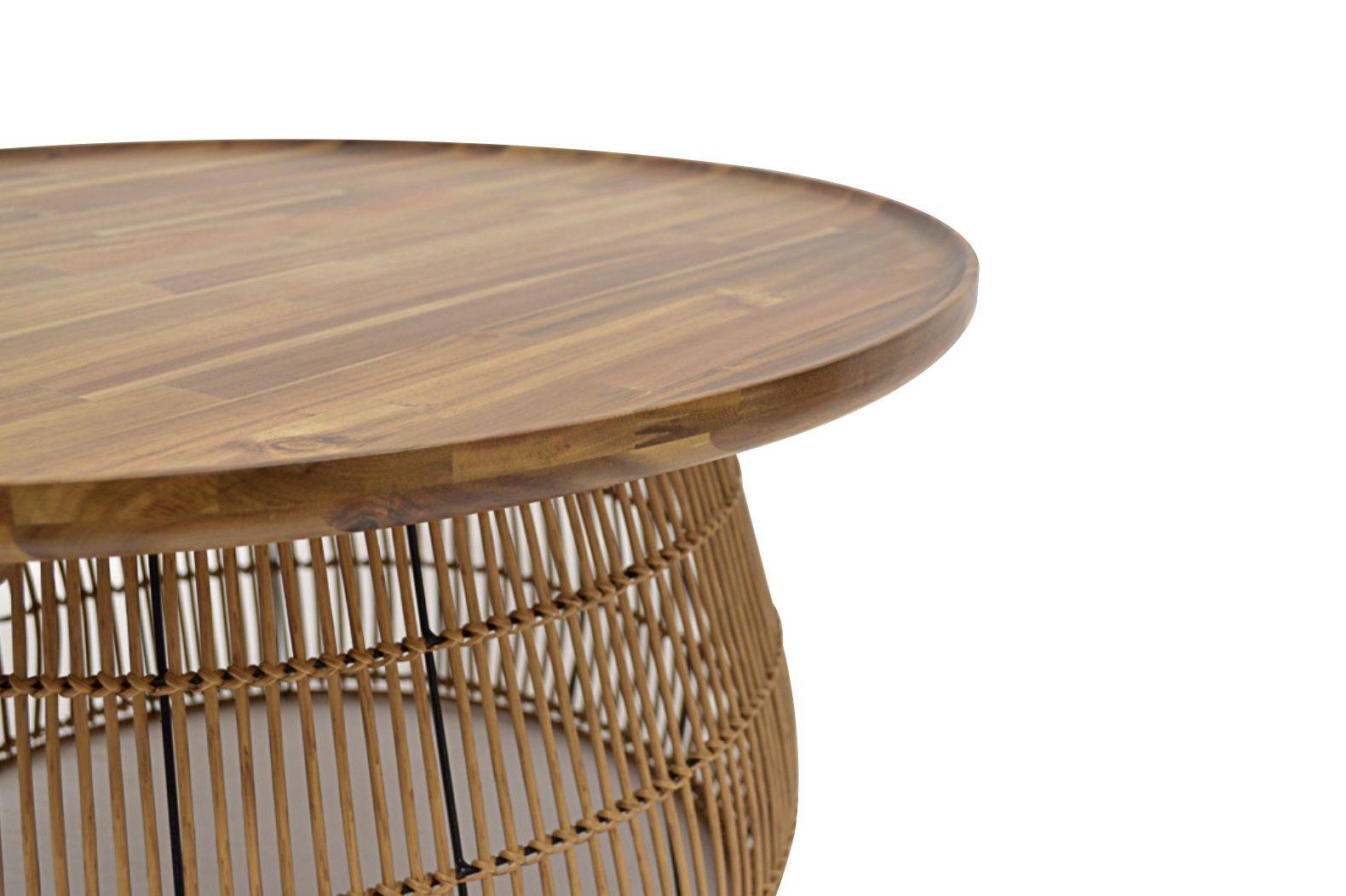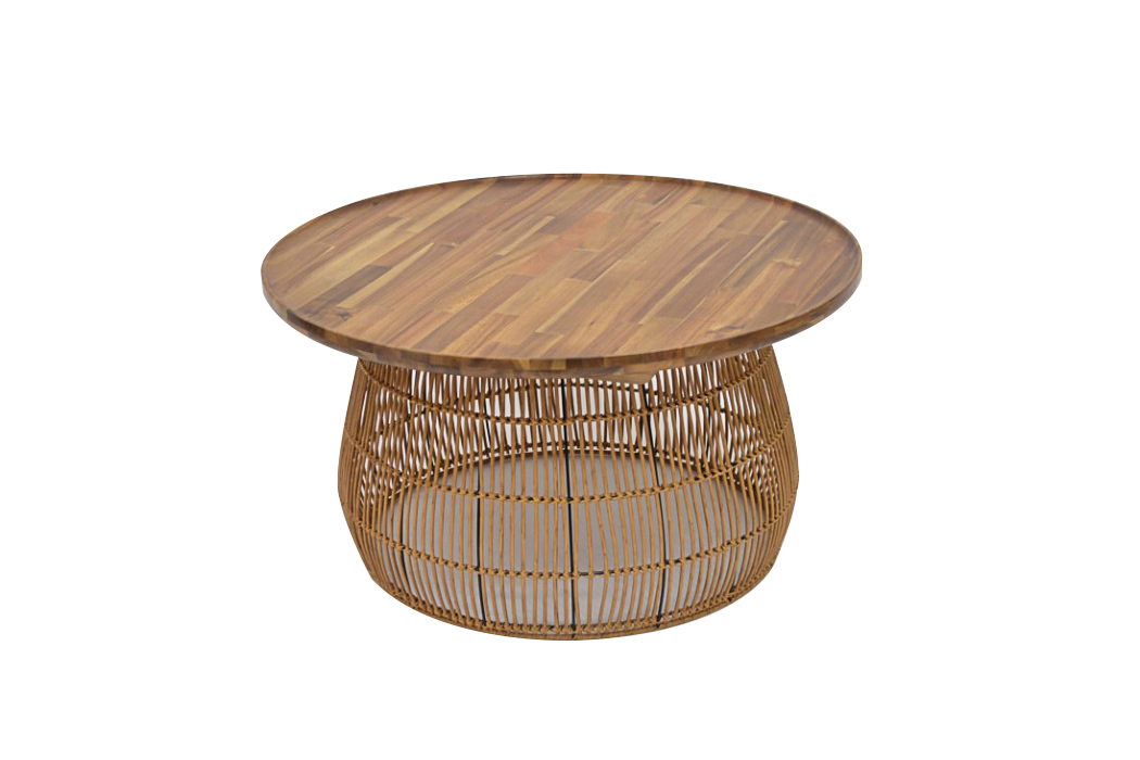 A statement round, rattan coffee table with a natural timber top. The walnut tones of the table give it warmth.