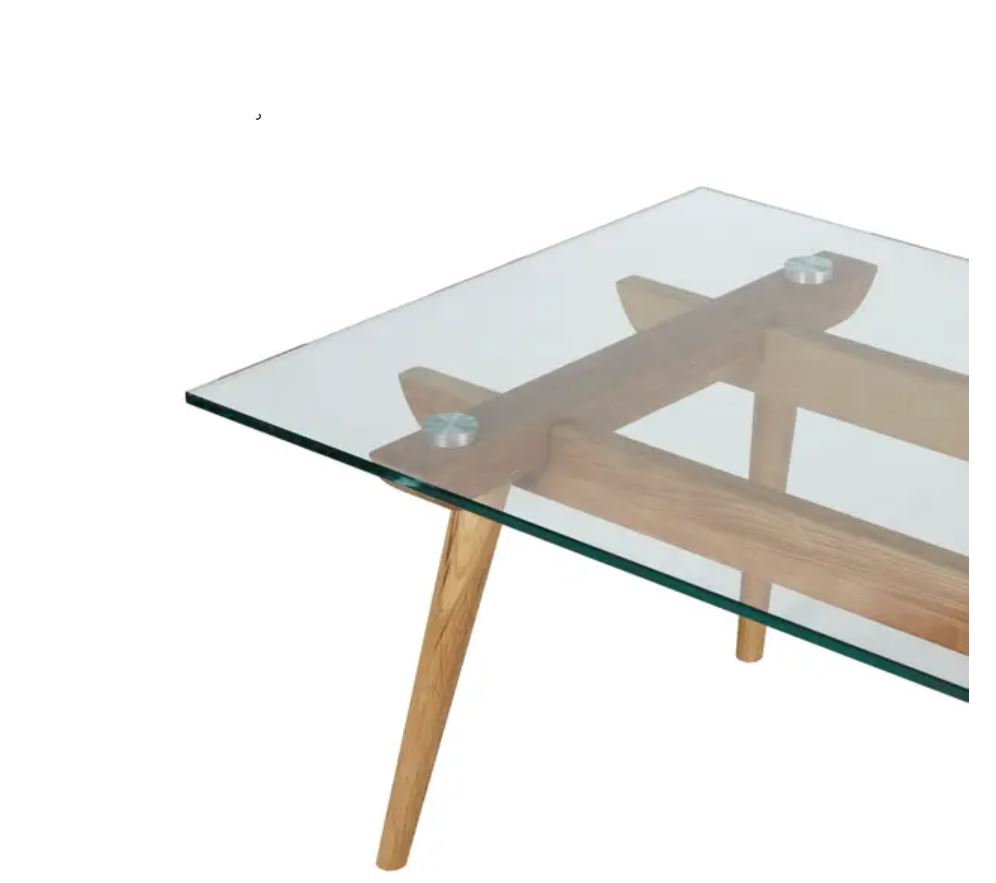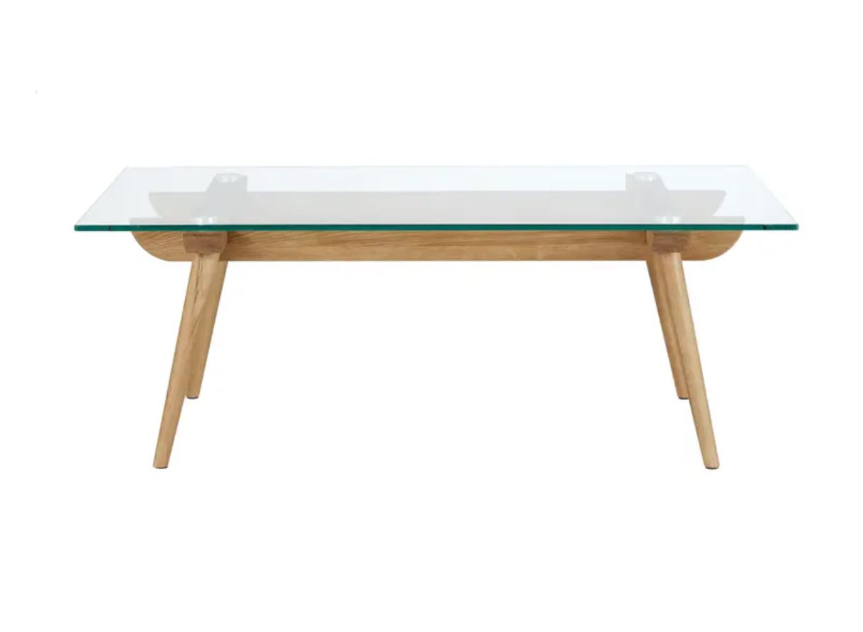 This glass coffee table has a timber frame, chrome detailing and a glass top. A matching entertainment unit, console and dining table are available.