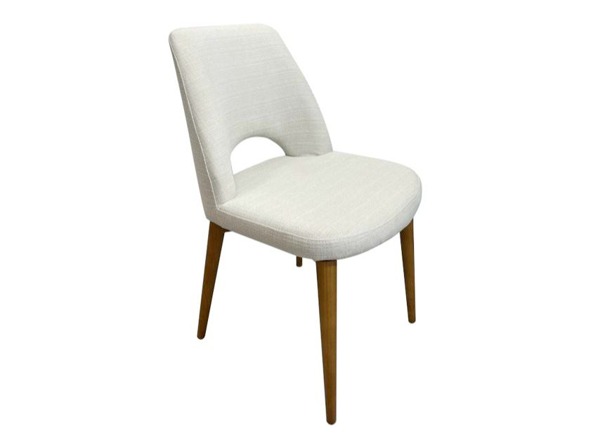 Modern desk chair with interesting back rest. Upholstered in light linen fabric with walnut timber legs.