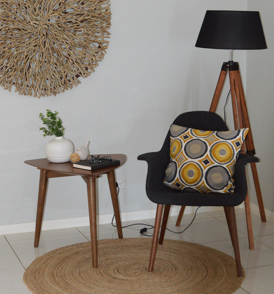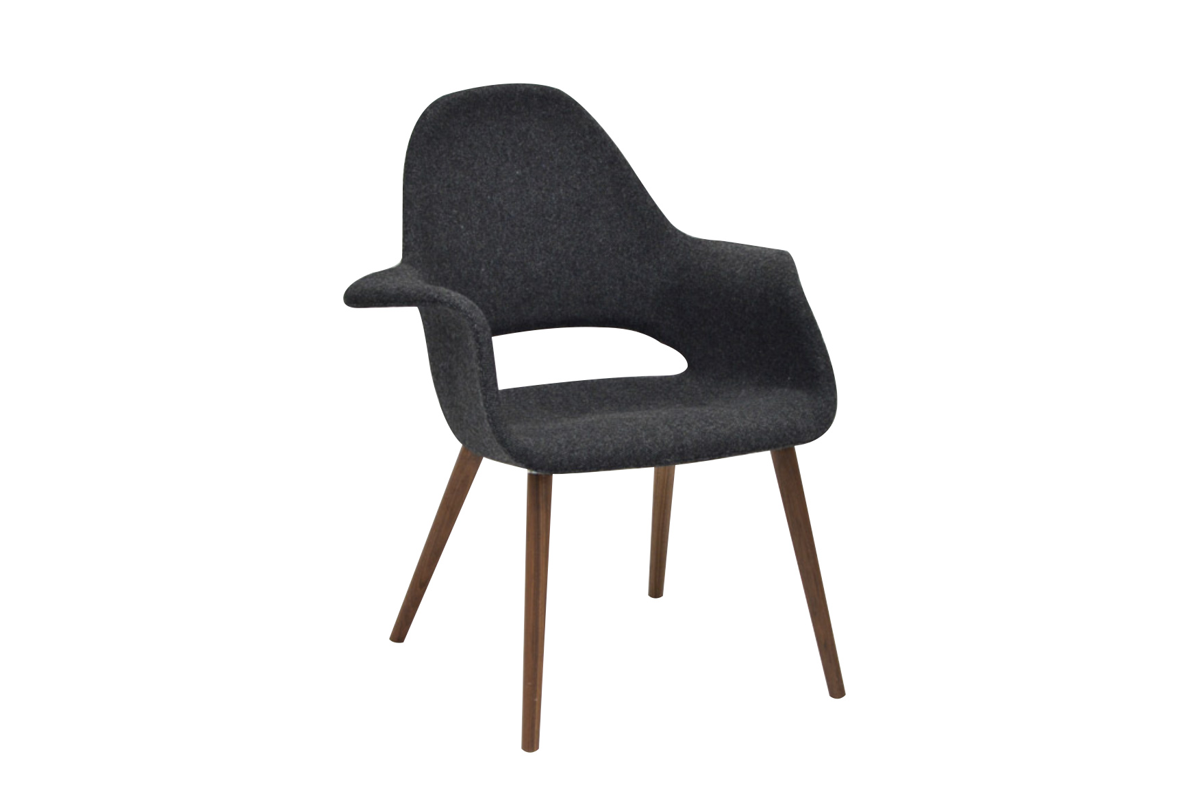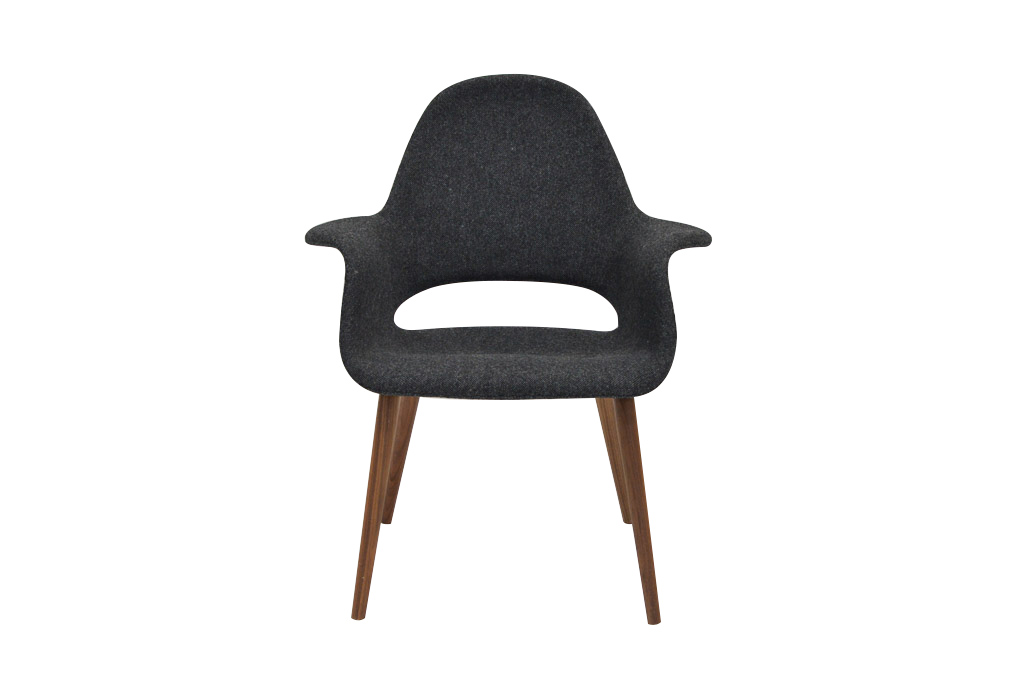 Timeless chair with moulded seat upholstered in a soft charcoal fabric. Walnut legs round off this attractive chair.