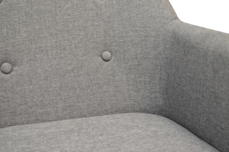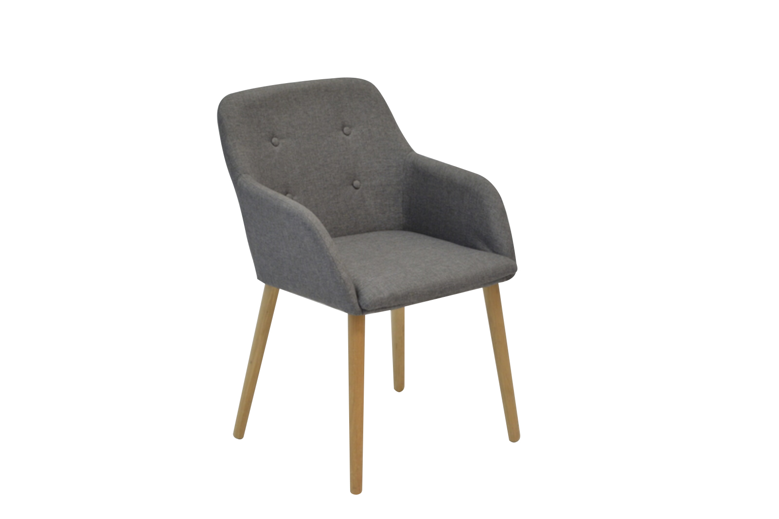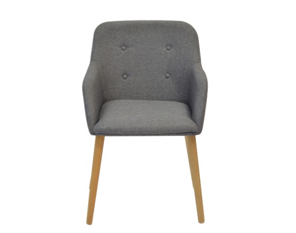 Compact, tub shaped occasional chair in medium grey fabric with light timber legs. Suited to smaller spaces or as a study desk chair.