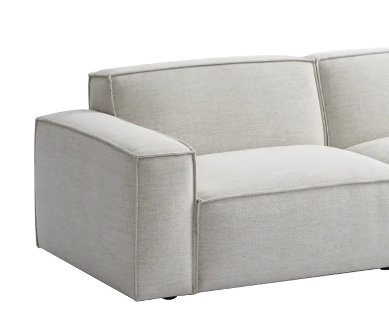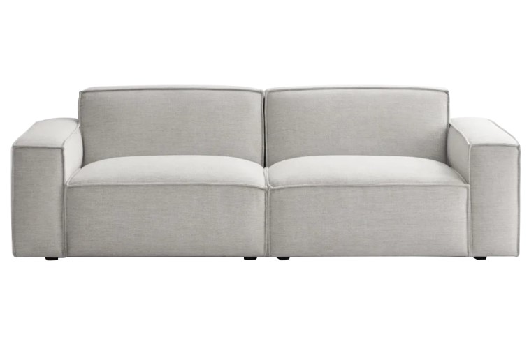 Boxy, low-to-the-ground three seater sofa upholstered in light, creamy white fabric.
