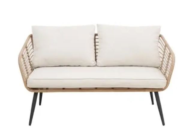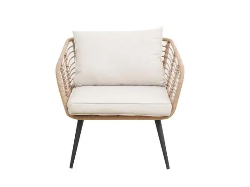 Natural colour wicker lounge set with sand cushions and powder coated metal frame.